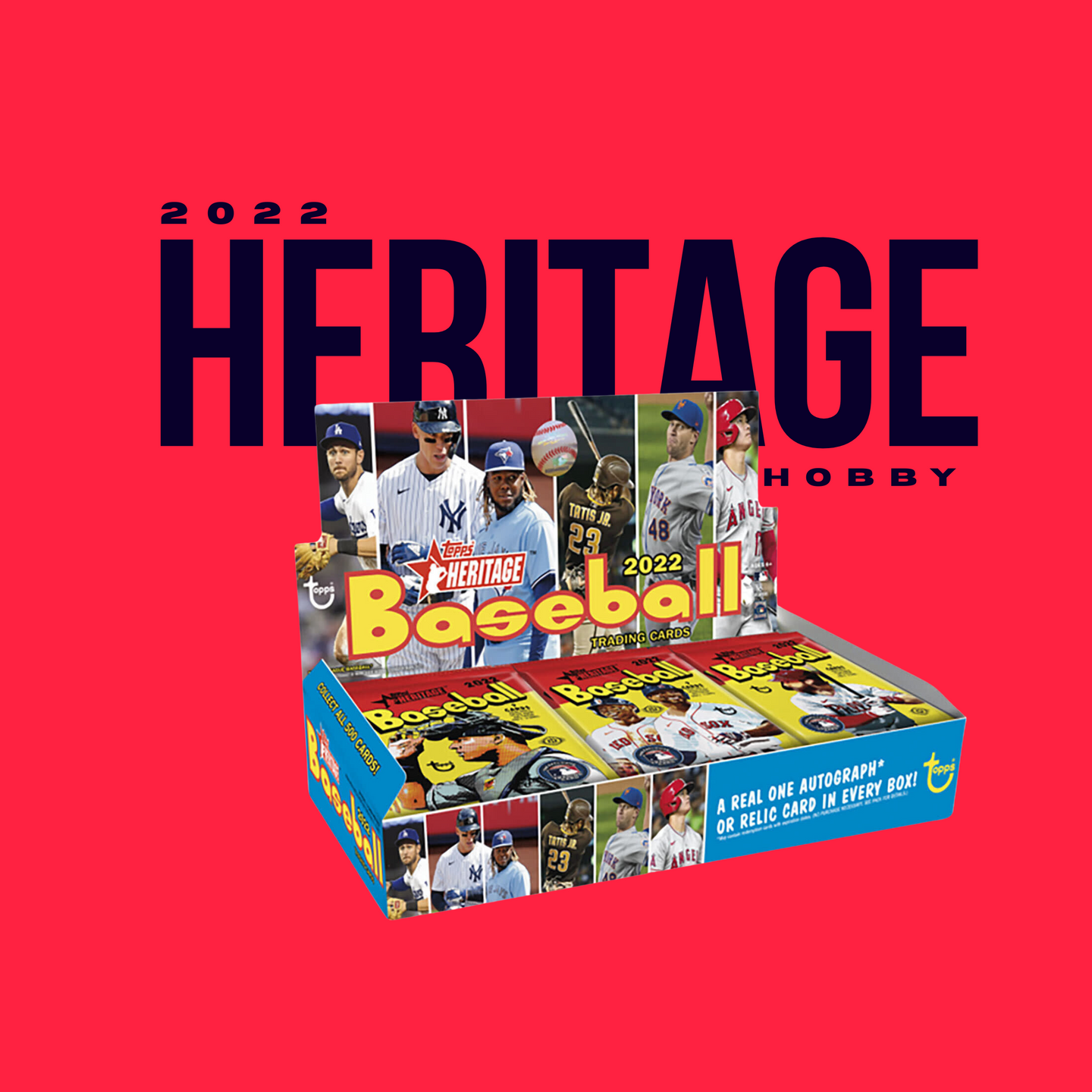 Each pack contains nine (9) 2022 Topps Heritage Baseball cards. Each box contains one (1) Autograph or Relic card.