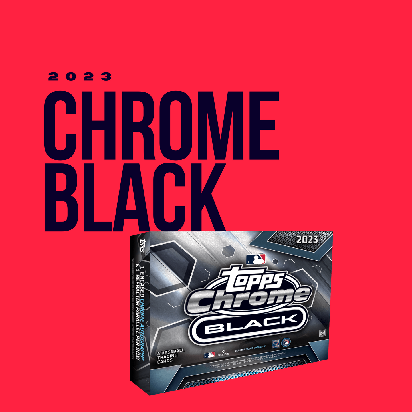 Each box contains one (1) 2023 Topps Chrome Black Baseball encased autograph card + one (1) Refractor Parallel + two (2) Chrome Base Cards.