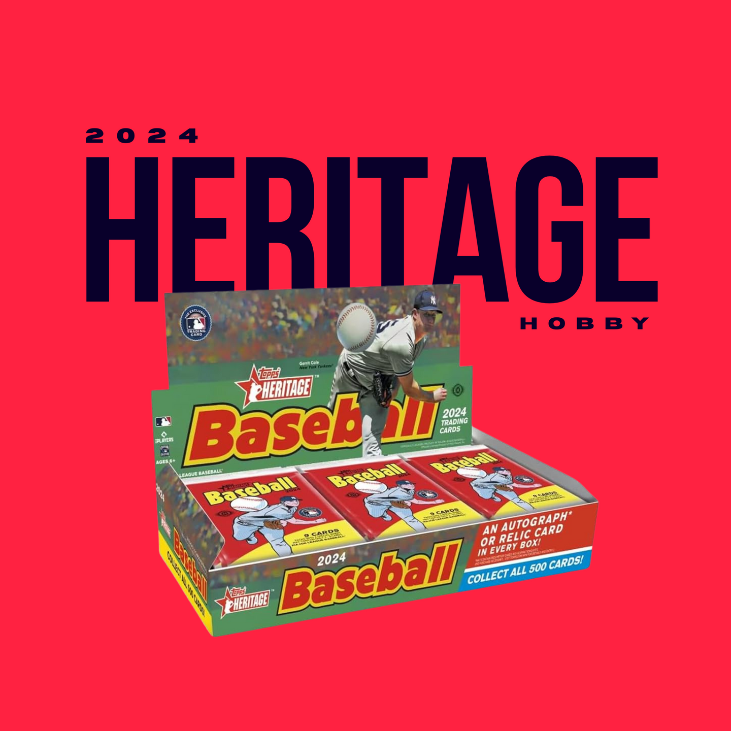 Each pack contains nine (9) Topps Heritage Baseball cards. Each box contains one (1) Autograph or Relic card, and one (1) box loader.